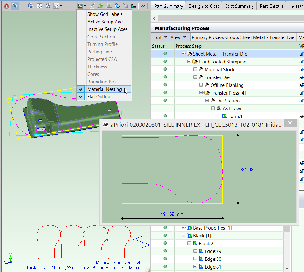 The cost model assumes the use of virtual sheet stock whose width is based on the results of the strip nesting calculations and whose thickness is based on part thickness—see