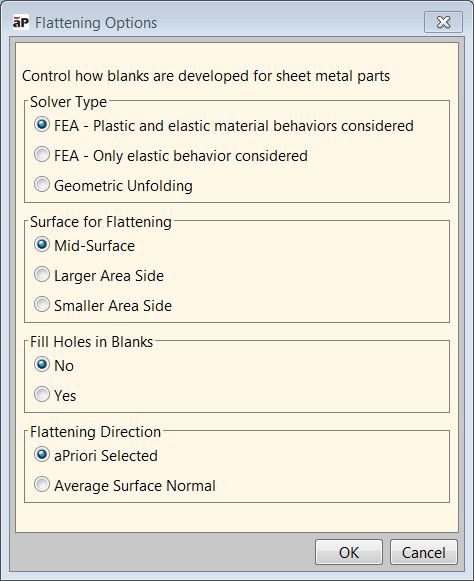 Note: aPriori internally detects whether a part is machined plate stock (no bends or forms). For such parts, aPriori uses a specialized blank size estimation method, and the settings in the Flattening Options dialog are ignored. In this case the Flattening Method property is set to PLANAR_PLATE_STOCK_UNFOLDING.