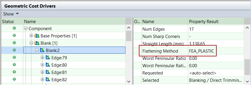 The Flattening Method property of the Blank GCD indicates the method used for the most recent geometry extraction. Its possible values include FEA_PLASTIC, FEA_ELASTIC, GEOMETRIC_UNFOLDING.
