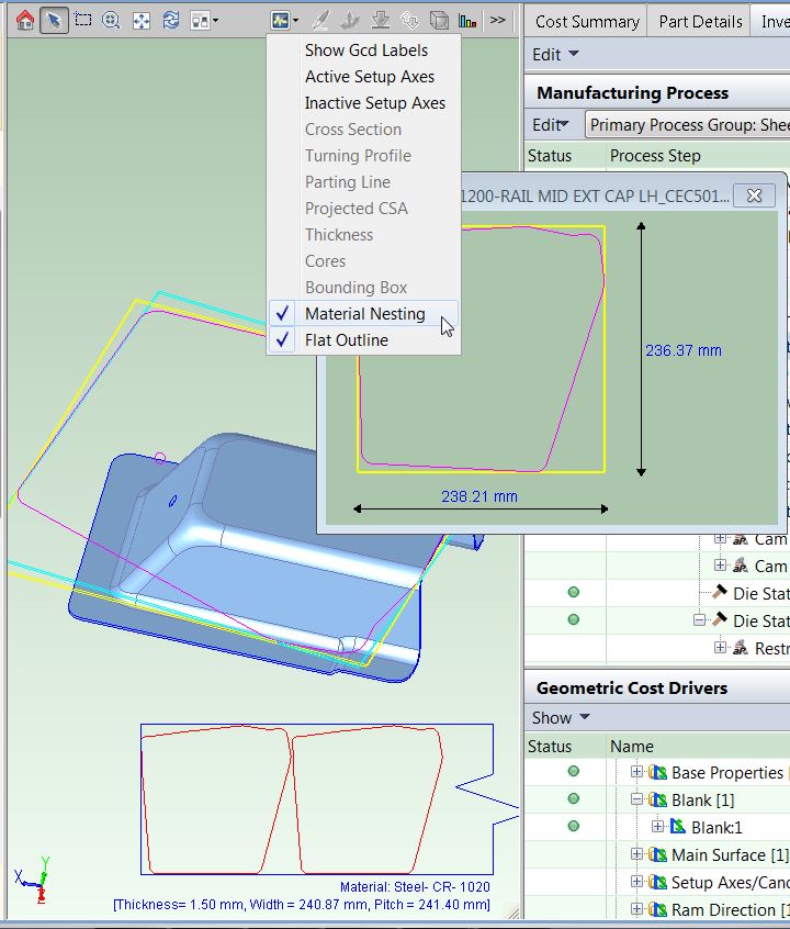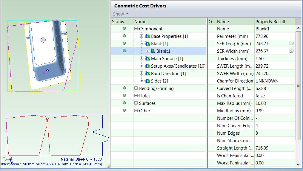 The Blank GCD is specific to the Sheet Metal process groups. It represents the flattened part. Its properties (such as Perimeter, Thickness, SER Length, and SER Width) are listed in the Geometric Cost Drivers pane, and are all independent of the blank’s orientation on the stock coil or sheet during offline blanking.