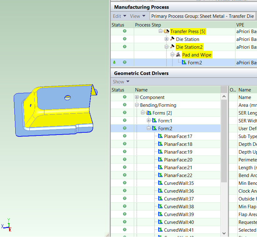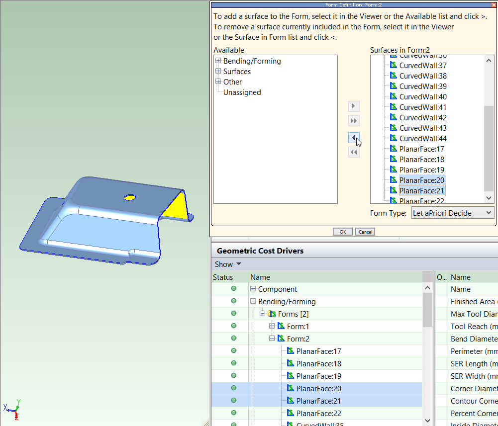 Surfaces in Form column. Note that when you select a surface, the opposite surface (directly on the other side of the blank) is automatically selected. Pairs of opposite surfaces are listed in the Geometric Cost Drivers pane under the Parallel relation, under GCD Relations.