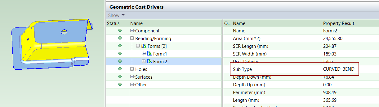 Geometry extraction also classifies each form as either a CURVED_BEND or EMBOSS. The classification is reflected in the SubType property listed in the Geometric Cost Drivers pane.