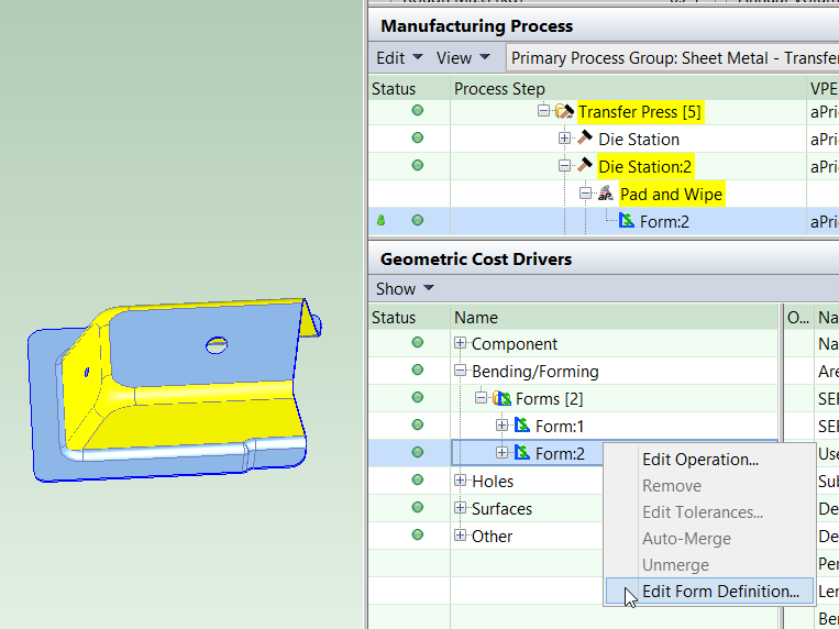 You can change a form’s subtype by editing the SubType property in the Geometric Cost Drivers pane, or by using the Form Definition dialog, provided you are connected to your part’s CAD model: