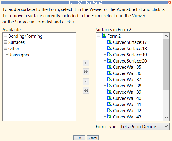 10 In the Viewer or in the left pane of the Form Definition dialog, select the forms that you want to include in the new form, and then use the arrow to move them to the Surfaces in New Form column.