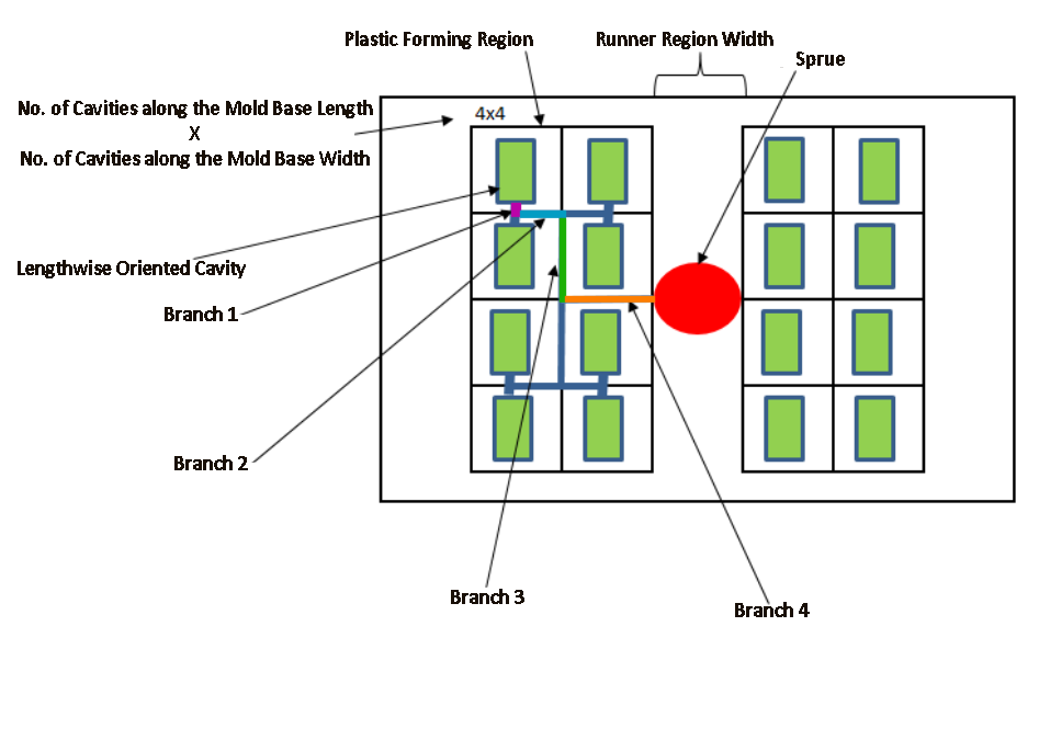 • The diameter of runner branches increases as the number of cavities they feed increases. In particular, the cross-sectional area of a branch is the product of the number of cavities the branch feeds and the cross-sectional area of the 1