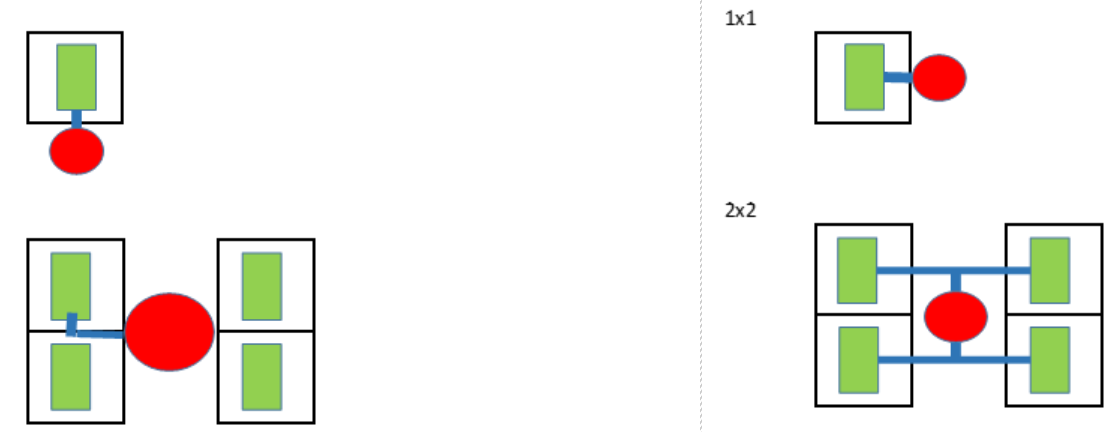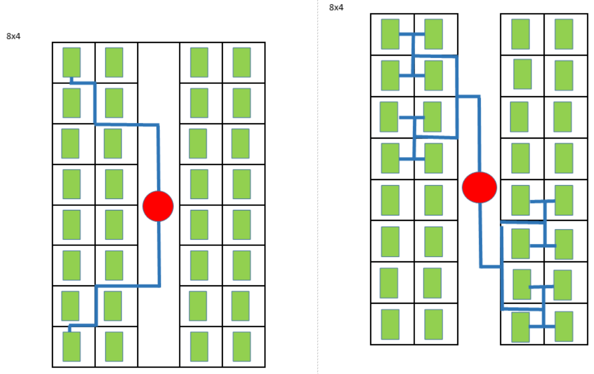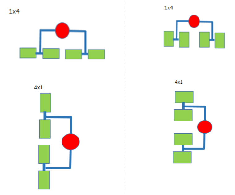 • Rotational Equivalence: the two runner layouts differ only with regard to overall rotational orientation. Each runner layout with an nXm cavity layout is a rotation of some runner layout with an mXn cavity layout, and is therefore equivalent for the purposes of runner area and volume calculation. Here are some examples: