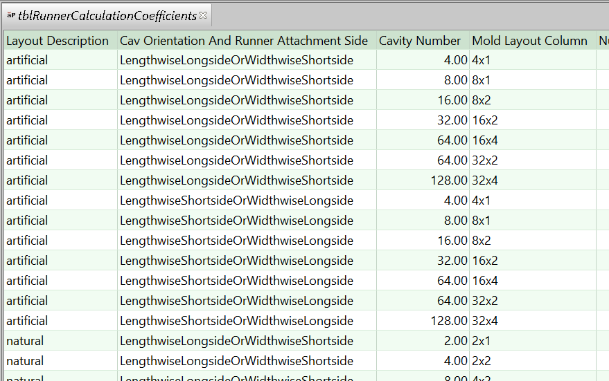 tblRunnerCalculationCoefficients, the cavity layout is specified in the column