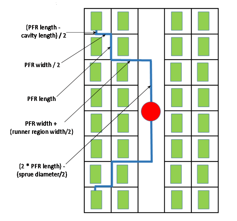 The illustration below shows some sample of runner length calculations. Note that “PFR” stands for “plastic forming region”: