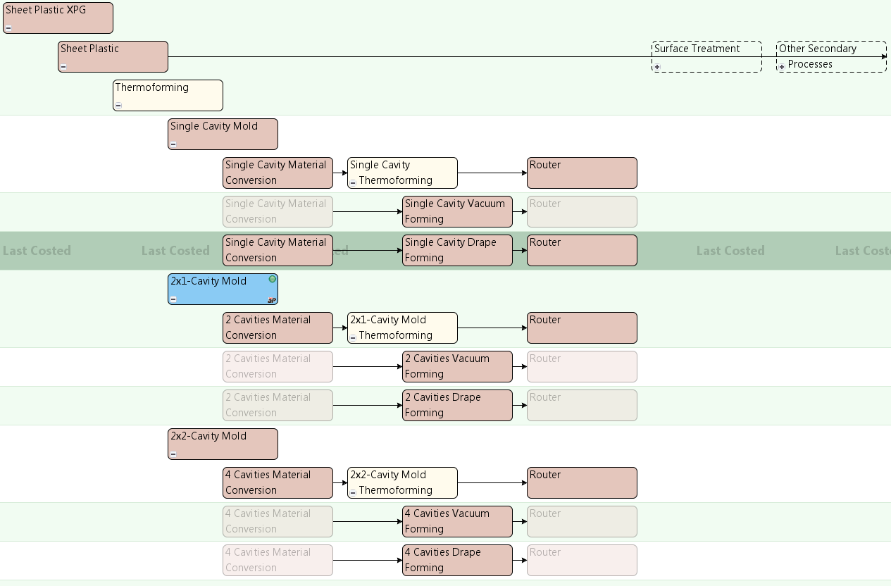 The sheet plastic routings are organized within three branches, based on the number of cavities in the mold. Within each of these branches, aPriori includes a material conversion process, two alternative thermoforming processes (a drape forming process for a positive mold and a vacuum forming process for a negative mold), and a router process.