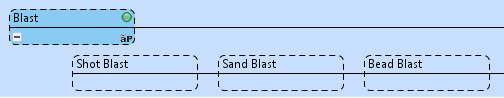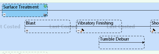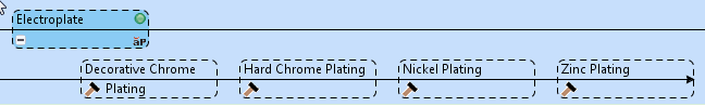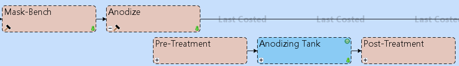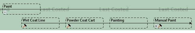 3 Click the + symbol on each intermediate node to expand it into distinct surface treatment processes. For example, the Painting Processes node expands into three distinct painting processes: a Wet Coat Line, a Powder Coat cart-based process, and a generalized Painting process that can be used to represent any painting process based on cost per surface area.