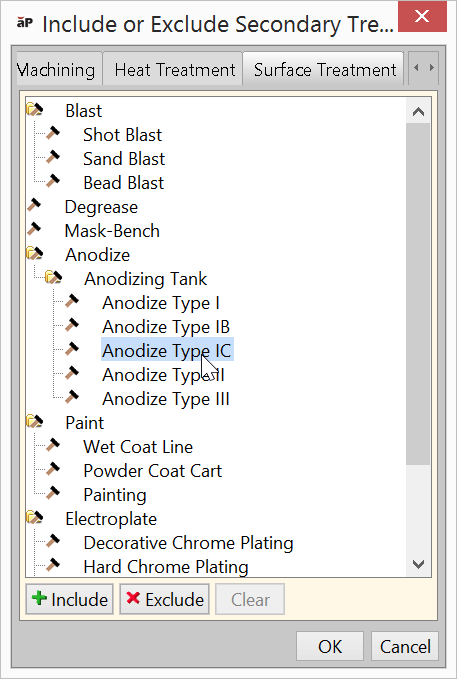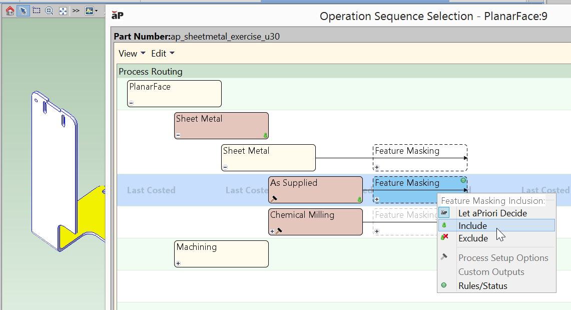 5 To remove a surface treatment process from a routing, right-click on the process node and select Exclude or Let aPriori Decide from the popup menu.