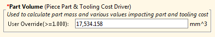 User Guided Costing. This value contributes to piece part and tooling costs. In particular, part volume is used to determine material utilization (see