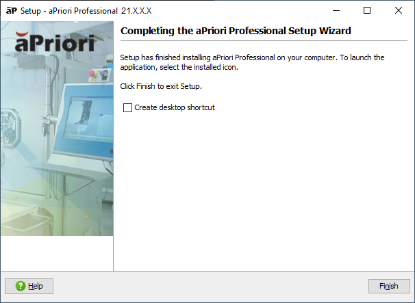 To add a shortcut for aPriori Professional to your computer desktop, select the Create Desktop Shortcut checkbox.