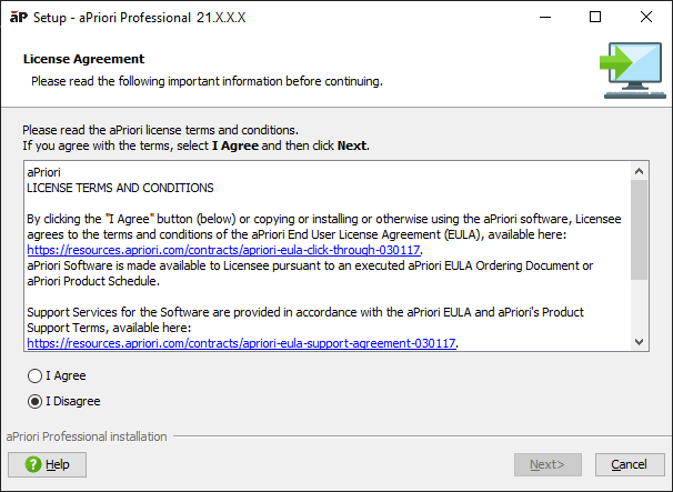 The License Agreement screen allows you to review the terms for installing and using aPriori Professional.