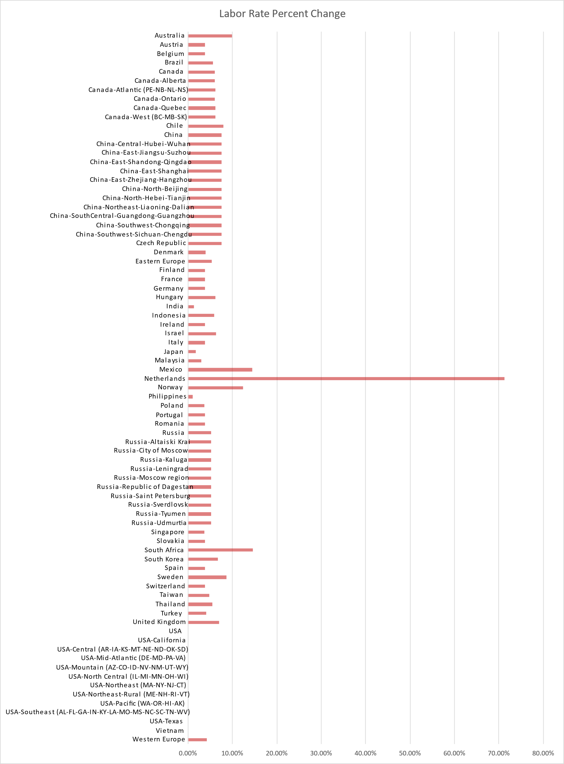 This chart shows Labor Rate changes relative to the 2020-09 Regional Data Libraries release. Most notably, Netherland labor rates show a large increase because our data supplier, Kerkhoff, is using a new data source that more accurately reflects the labor rates in the Netherlands.