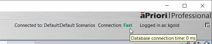 aPriori Professional 2021 R1 provides a database connection speed monitor which reports and characterizes the speed of the connection (latency) between the aPriori client application and the aPriori database server. This enables users to determine if their network latency does not meet aPriori’s required or recommended levels and therefore may prevent proper functioning of the aPriori application. This connection time measured is the