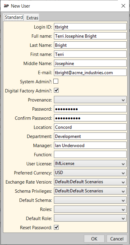 These extra fields enable you to use additional information about each user to affect aPriori behavior. You can use these fields in whatever way makes sense for your company. For example, you could use these in conjunction with Access Control rules (as properties to the "currentUser" subject), or to implement new custom workflow capabilities delivered by aPriori’s Professional Services team.