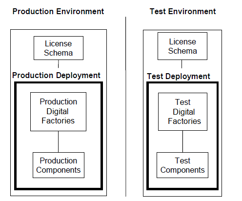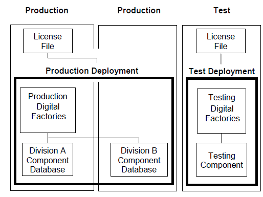 • A company that develops Digital Factories internally should develop their Digital Factories in a separate “development” deployment. Once these have been verified, the Digital Factories can be published to their end-user deployment. This can be linked the same license file as the end-user production deployment.