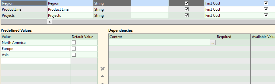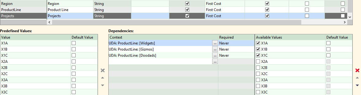 You can define three UDAs for Region., Product Line, and Projects, and give them predefined lists for the values. But if you place these lists on the Cost Guide and expect your users to select the correct combination of values when costing components, there’s a very good chance they could get it wrong and spend a lot of time in the process. For example, a user could select “North America” for the region, and “Gizmos” for the product line, and “X3B” for the project – none of which match the other values.