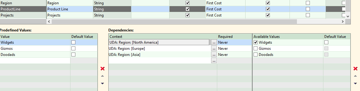 2 Define a Predefined List UDA for Product Line. Note that this UDA has Dependency Contexts on Region. North America is shown, but you would need to define dependencies for Europe (Gizmos) and Asia (Doodads) also.