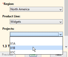 Now when your users click through these attributes in order (top to bottom), each selection will determine what the next menu will offer. For example, selecting “North America” for the region ensures that only “Widgets” is available for Product Line, and only “X1A, X1B, X1C” are available for Projects: