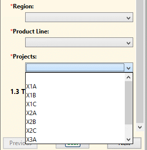 The Projects UDA drop-down menu will display a completely unfiltered menu (i.e., it displays all possible items). For this small example, this is not a huge problem: only nine items show up. In a real-life situation, the user might be overwhelmed with dozens or hundreds of options. And if they select one, and then select an item in the Region or Product Line that does not support that project, their original selection will be cleared and they will need to make another selection, this time from the valid options shown.