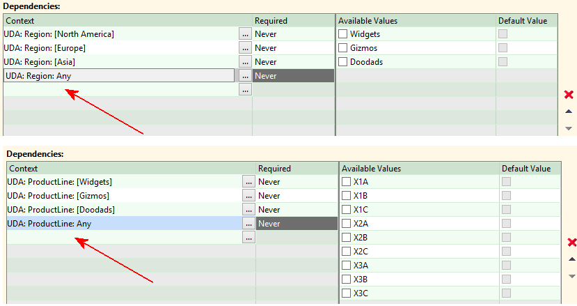 (You specify “Any” by leaving the Values column blank when you define the Dependency Context.)