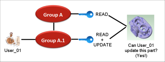 Note: Group Inheritance vs. "Most Restrictive Permission Wins" – As mentioned above, a user who is a member of a sub-group is also automatically a member of all of that sub-group's parents. So what happens if a user belongs to a sub-group that grants Read + Update permission to a component, but the parent group grants ONLY Read access? Does the more restrictive permission of the parent prevent the user from updating the component?