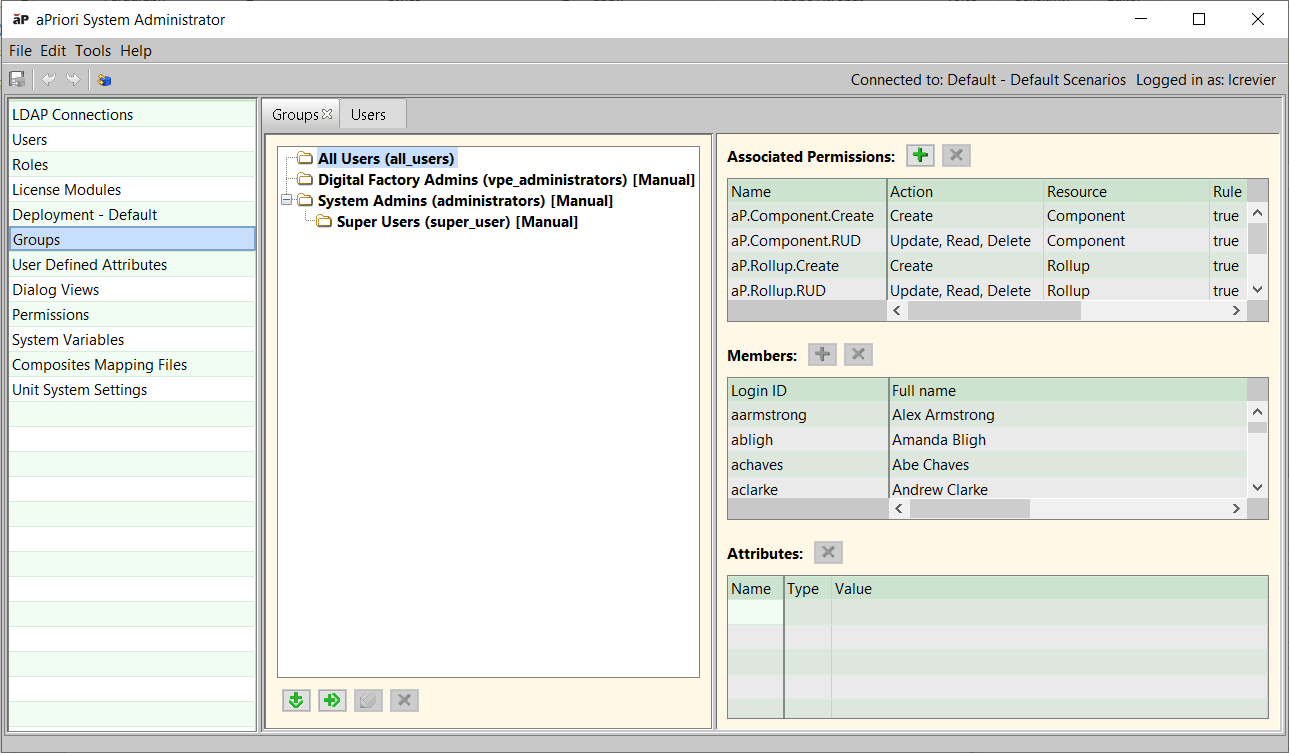Note that you can only edit the name or the Group Membership setting with this button. To edit the Permissions, Members, or Attributes of a group or sub-group, select it and use the panes on the right side of the window. Further note that you cannot edit the All Users or Super Users groups at all, and only the Group Membership setting for System Admins and Digital Factory Admins.