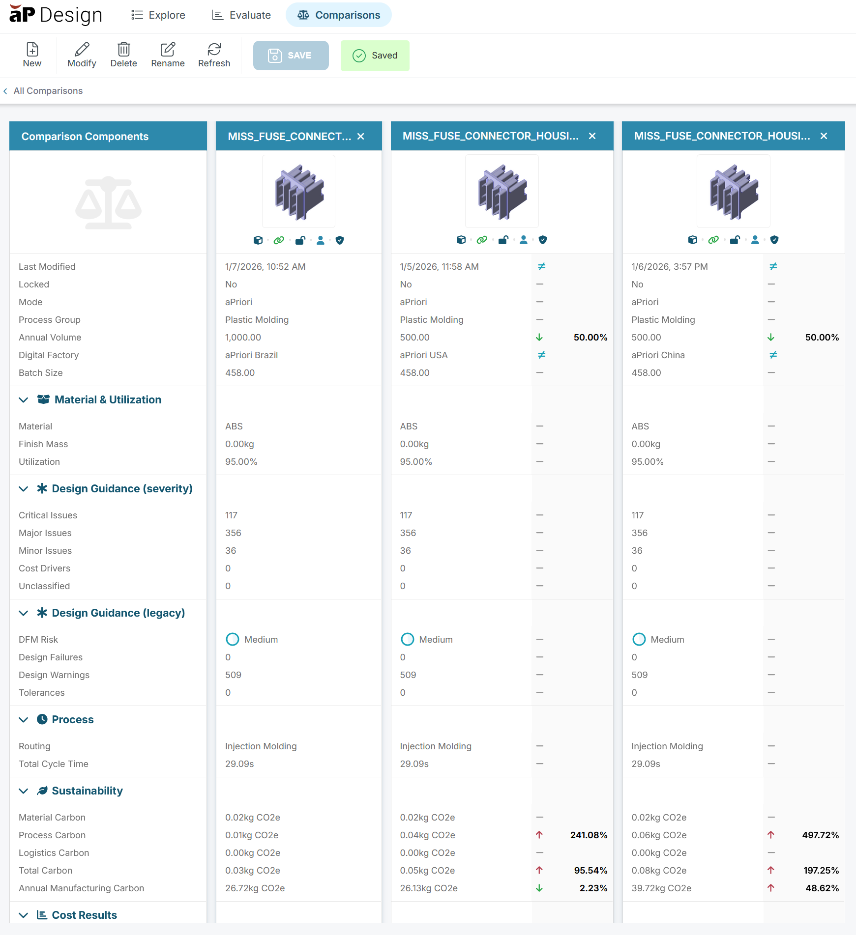 Note: The comparison view may show two Design Guidance sections: one displaying legacy summary results and one displaying results grouped by severity. See the Jan 27, 2025 release notes for more information.
