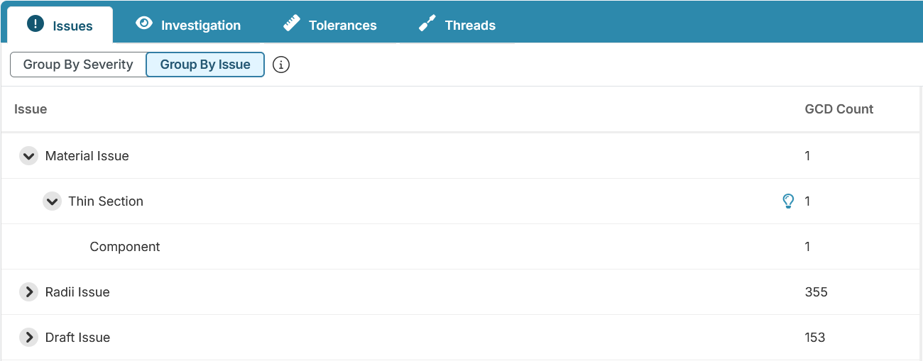 The Issues tab identifies Geometric Cost Drivers (GCDs) that created issues with analysis, which made it difficult (Design Warnings), time consuming, or impossible (Design Failures) to manufacture the component using the selected material, Process Group, and Digital Factory.
