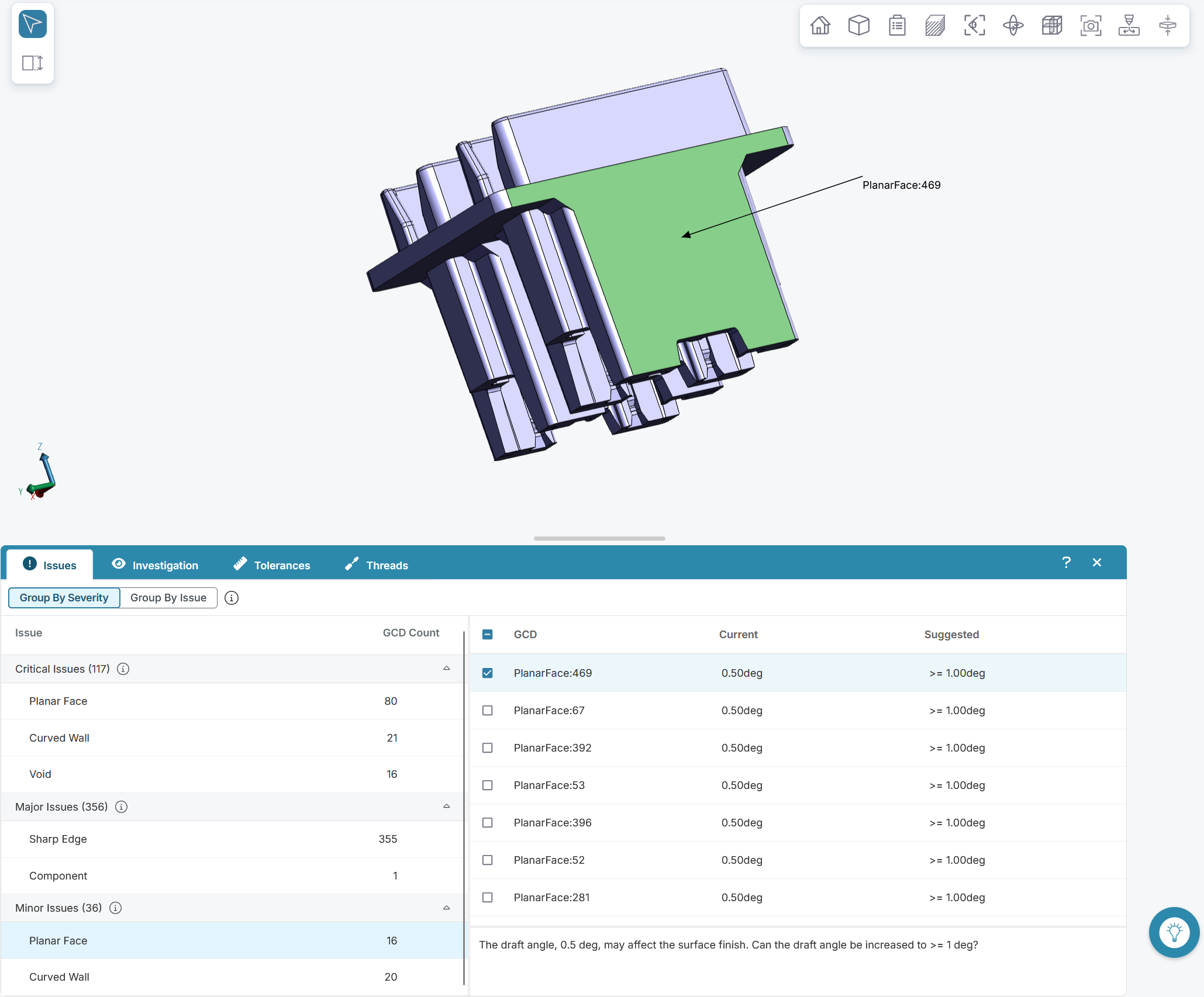 Select an issue in the table to see more information and to highlight the affected GCDs in the 3D Viewer. The right pane displays a brief description of the selected issue. For example, the description for this Draft issue indicates that the draft angle, 0.5 deg, may affect the surface finish: