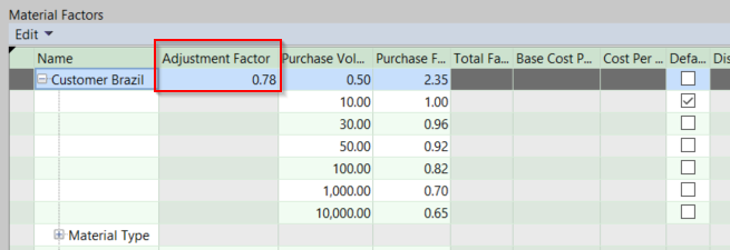 If you wish to adjust the pricing without updating the overlay/inheritance structure to a new WORLD AVERAGE inheritance, you can update the Material Adjustment Factor within the Material Factors table. aPriori advises using an adjustment factor of 0.78, as this is the 12-month rolling average for the ratio of material prices between the WORLD AVERAGE and NORTH AMERICA pricing levels.