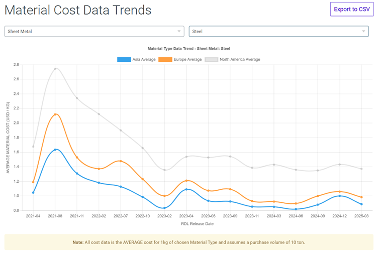 For a more in-depth regional breakdown of changes in material rates, please view aPriori's Material Cost Data Trends page. This page breaks material costs down into our Asia, Europe, and North American regions. Below is an example image showing the trends of steel prices per region up to the release of 2025-03 RDLs.