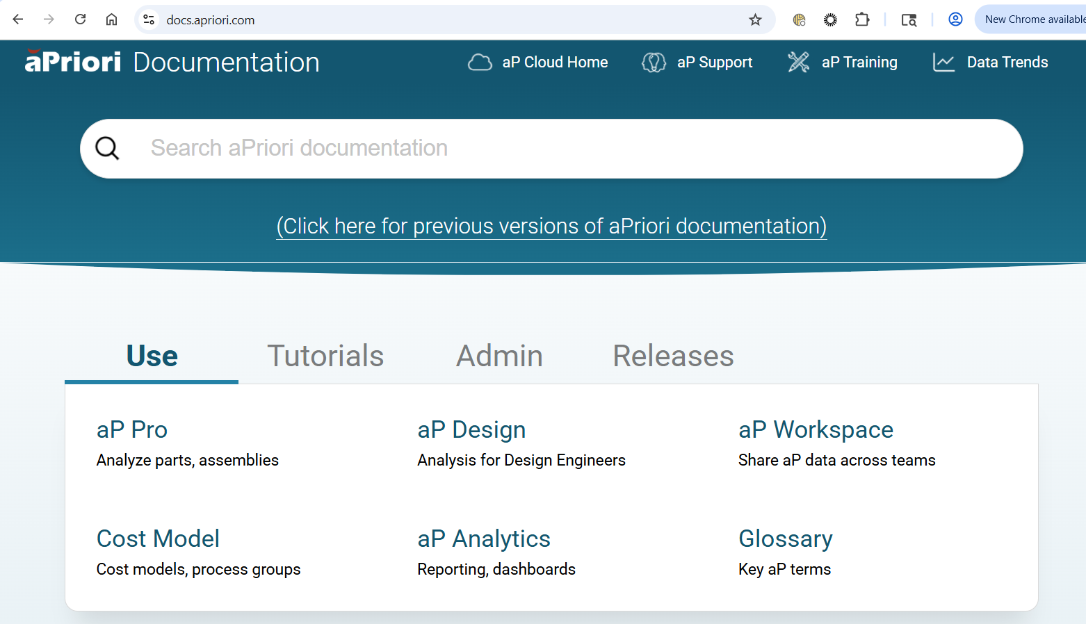 aPriori now has a new User Documentation portal at docs.apriori.com. This includes: