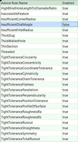 To enable or disable a specific design guidance check, open the Digital Factory Manager module and find the Lookup Table named adviceRules under the manufacturing process group of interest. For example, draft angles can sometimes be noted on 2D drawings and not modeled in 3D CAD. In such cases Digital Factory managers can set InsufficientDraftAngle to false (shown below), deactivating unnecessary draft angle feedback. This configuration table makes it easy to tailor feedback so that aPriori flags only actionable issues.
