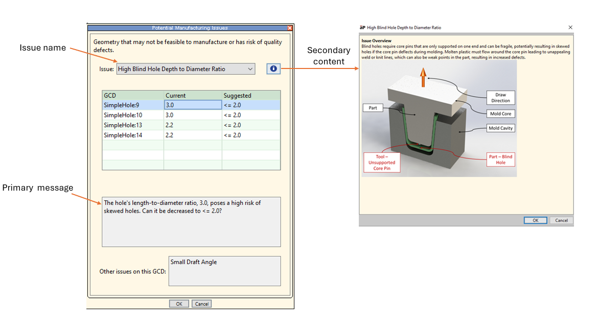 The latest Forging and Plastic Molding process models (CMV280 and CMV300, respectively) provide enhanced design guidance messaging to help design engineers understand each design issue and how to address it. Previously, in some cases, design guidance issue names did not clearly identify the problem with the design and/or the primary message did not provide a recommended action to resolve the issue.