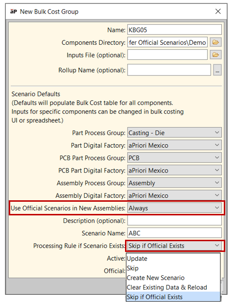 In aP Pro 2025 R1 SP2, the option Use Official Scenarios in New Assemblies is now available in the New Bulk Cost Group dialog, as shown below. If this option is set to Always, aPriori will associate any pre-existing official scenarios of subcomponents with a new assembly scenario, if set to Never, aPriori will associate subcomponent scenarios that have the specified Scenario Name with the assembly scenario, consistent with the bulk costing behavior in previous releases.