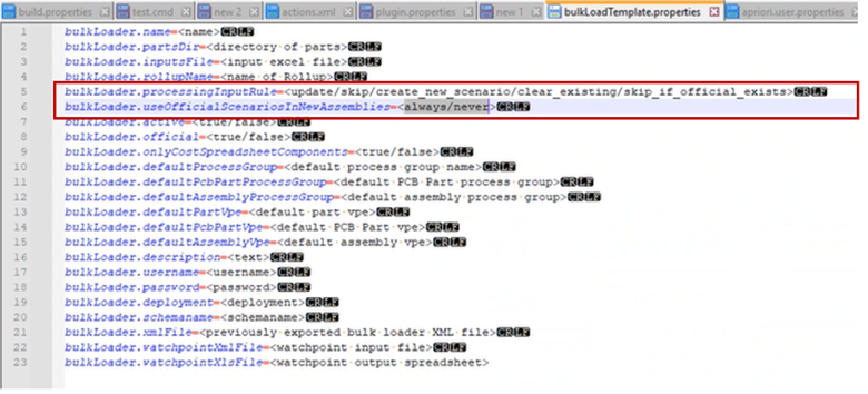 These new inputs also are available when you run Bulk Costing & Analysis from the command line. As shown below, the Bulk Costing Properties File (also called the bulkLoad.properties file) was extended to set Use Official Scenarios in New Assemblies to either always or never. (If not specified explicitly, never is the default.) The default value of Processing Input Rule now can be set to skip_if_official_exists, in addition to the previously-supported values. Specific (non-default) values can be set for individual components within the bulk costing input spreadsheet, if needed.