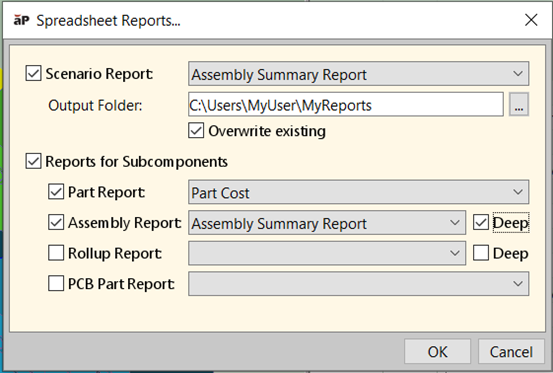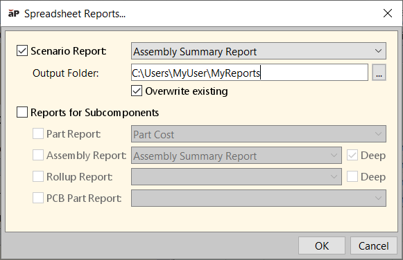 To create a spreadsheet report for a single part scenario, open the scenario and select Reports > Spreadsheet Reports. A consolidated dialog appears which allows you to specify the type of report, a folder location to save the report, and an option to overwrite any existing reports already in that location. Previously these inputs were provided in separate, successive dialogs.