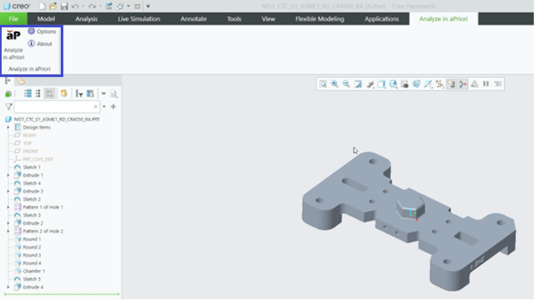The aPriori 2025 R1 SP2 release completed the rebrand of the aPriori CAD Plugins. Plugins for the Creo and Inventor CAD systems have been renamed to “Analyze in aPriori”, and the plugin tab, toolbar buttons, and tooltips within the CAD system now reflect the updated terminology. For example, the picture below shows the Creo application and the updated tab and toolbar buttons: