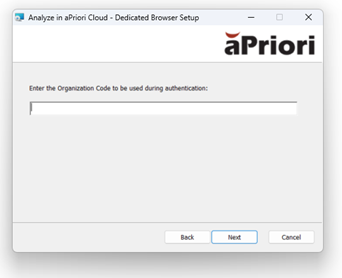 The aPriori Dedicated Browser install wizard now has the option to set the customer code, so end users do not have to remember this code during login: