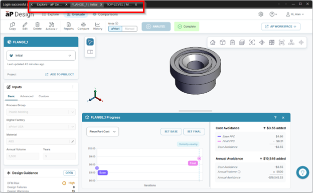 Now when a user is working with multiple scenarios in aPriori, the browser allows each scenario to exist in its own named tab, as shown below. This is particularly useful when working with assemblies or trying to compare different CAD options for a part.