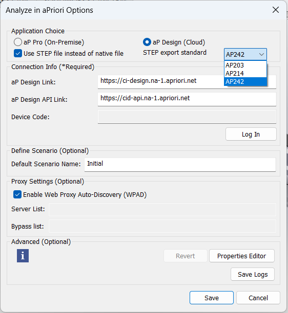 All Analyze in aPriori plug-ins except the Creo plug-in now can export to STEP AP242 format, as well as other STEP formats and the native CAD format.
