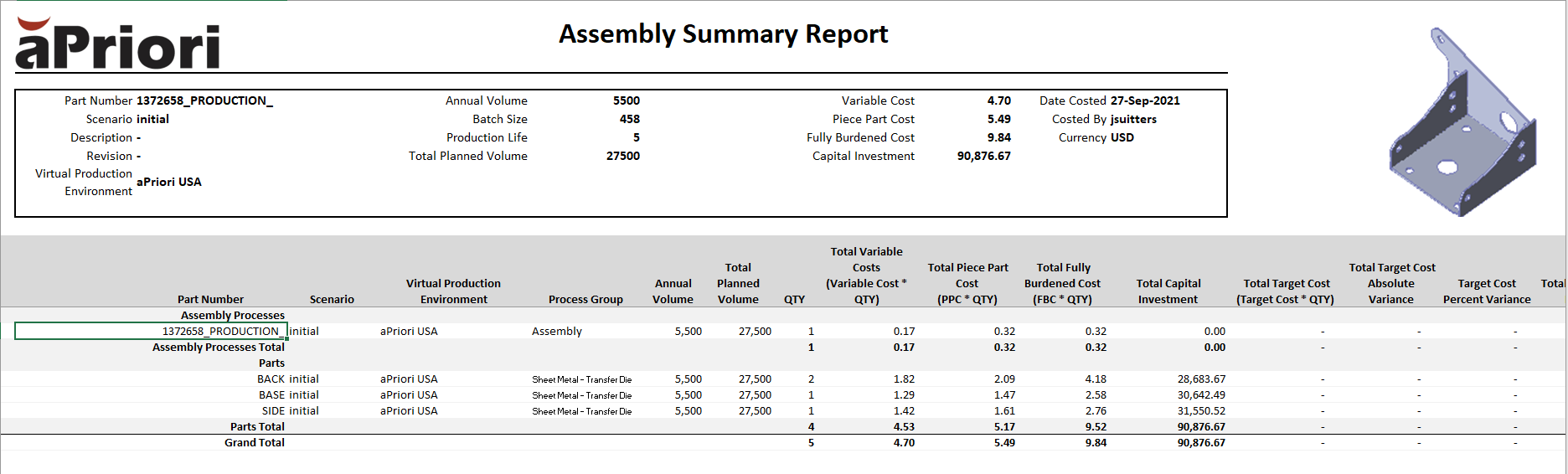 This report can be run for any fully costed assembly in aPriori, to show a top-level cost breakdown for the assembly and its subcomponents.