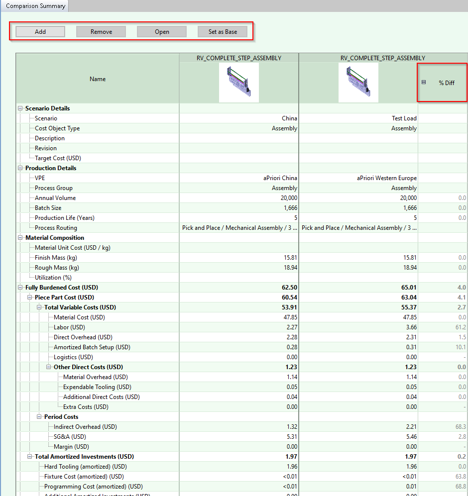 Compare the assemblies or scenario, as described in Compare Scenarios, creating a comparison view: