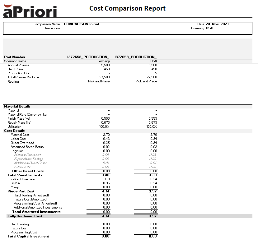 You can export a comparison view as a report, comparing costs for multiple assemblies or scenarios.