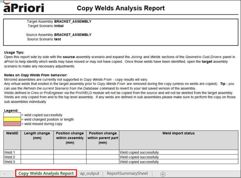 This report shows the success of a Copy Welds From operation (see Create Virtual Welds). The report displays the status of each of the copied welds, indicating whether the copy has been successfully completed, or if the geometry differences between the assemblies has caused any welds to fail.