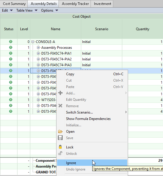 Tip: Use the Undo Ignore command beneath Ignore to add the component back into the display and cost calculations.