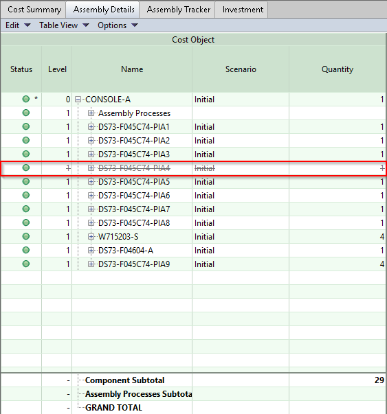 This component is then removed from costing for that assembly, even if the component is a member of a deep costing assembly (see Deep Costing).